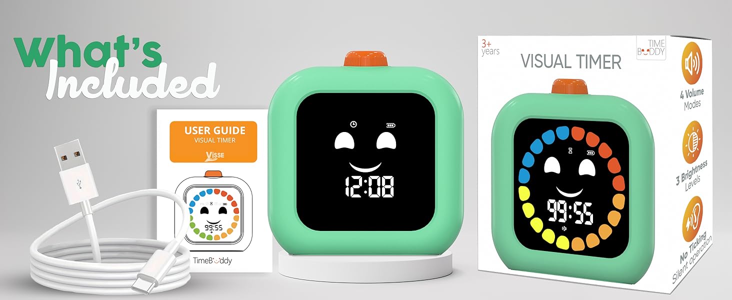 The timer offers adjustable alarm modes, brightness levels, and selective screen displays. These options allow parents and educators to tailor the timer to each child's specific needs, providing clear visual cues and quiet operation.